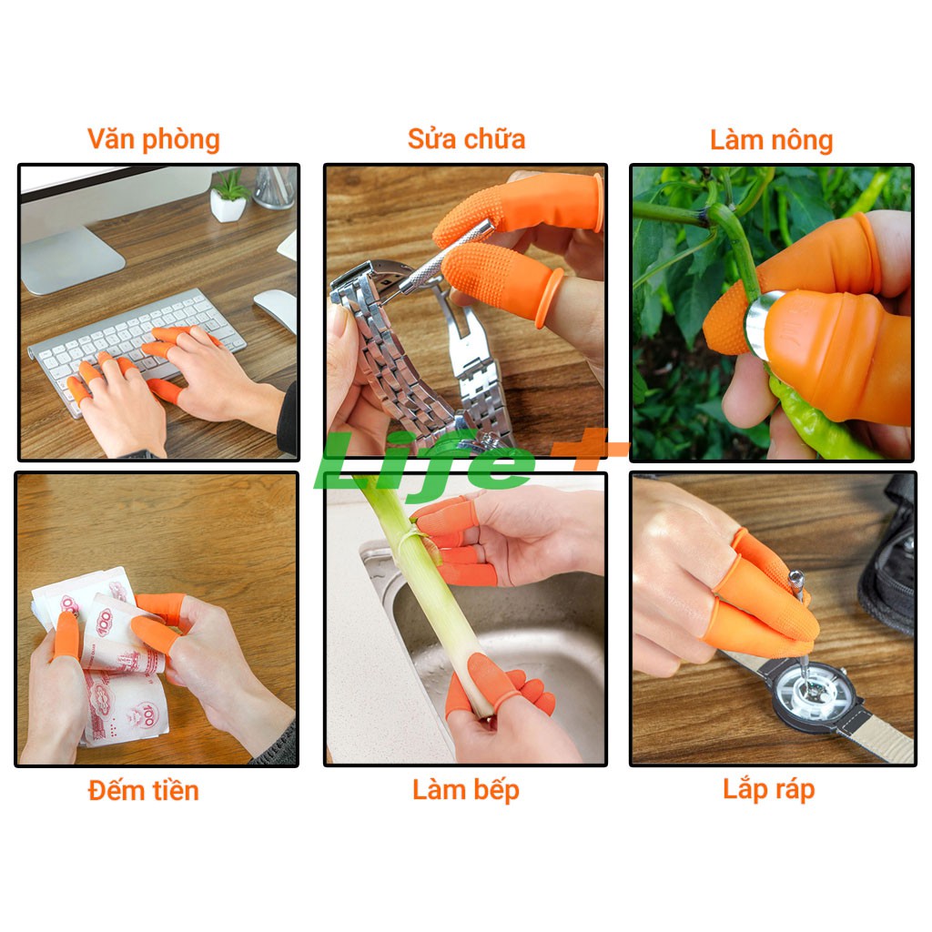 chất liệu cao su tổng hợp, đàn hồi tốt, ôm chặt lấy ngón tay người dùng, không gây kích ứng daKết cấu hạt sần ở đầu bao ngón gia tăng mức độ ma sát và khả năng bám dính khi cầm nắm đồ vật, dụng