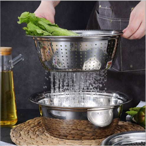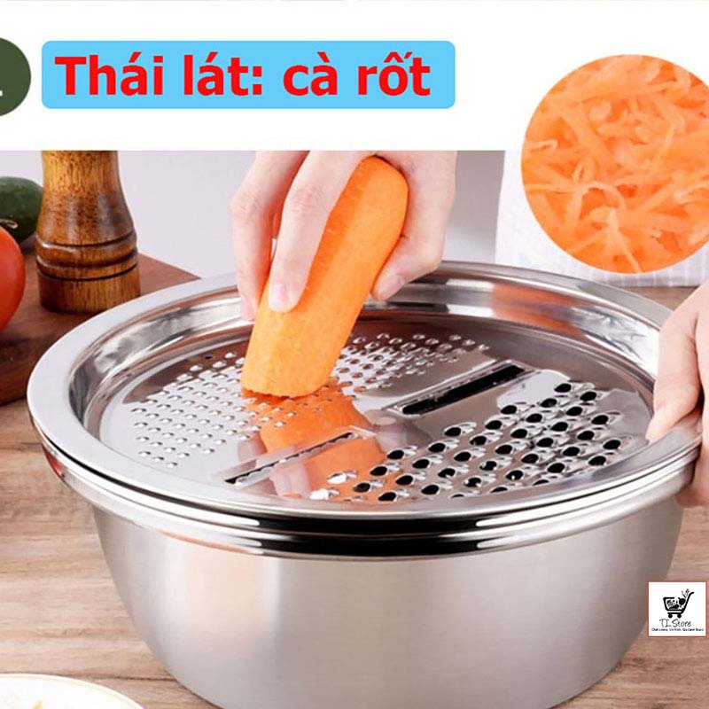 Nhà cửa & Đời sống > Dụng cụ nhà bếp > Bàn nạo, dụng cụ bào, cắt || Bộ bào rau củ kiêm rổ và chậu Inox cao cấp đa năng 3 trong 1 (RỔ 3)Còn hàng