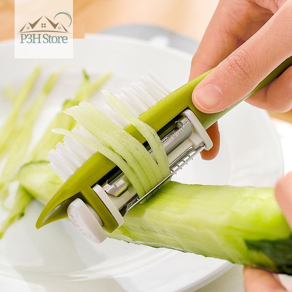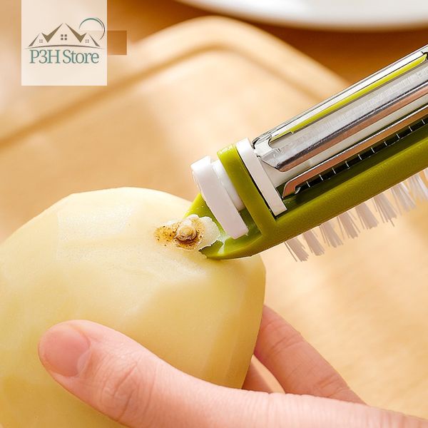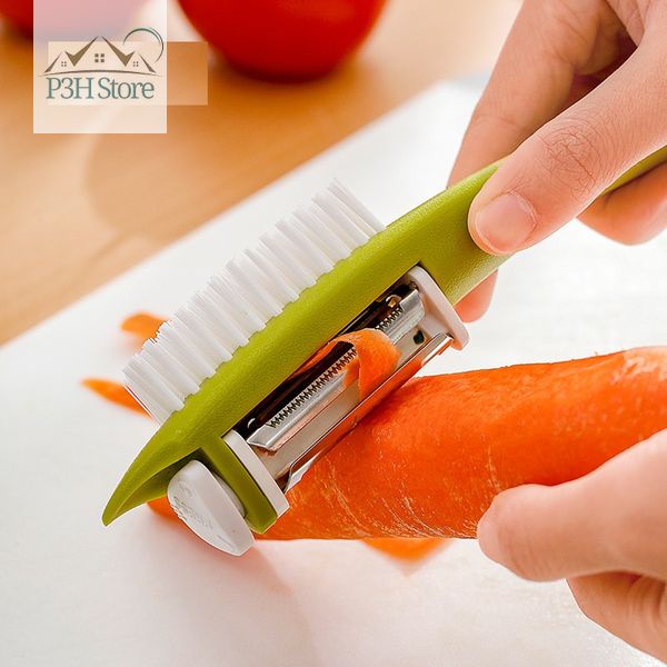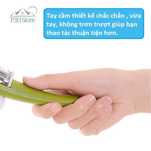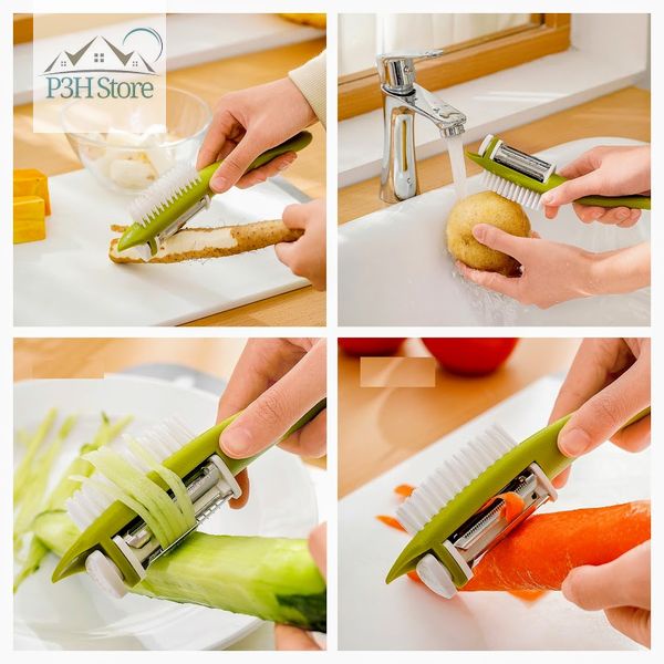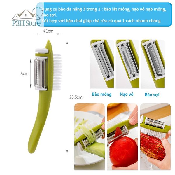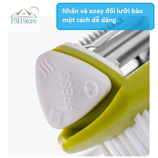 - Dụng cụ gồm 3 lưỡi bào có thể dễ dàng chuyển đổi kết hợp với bàn chải dùng vệ sinh củ quả trong lúc bào