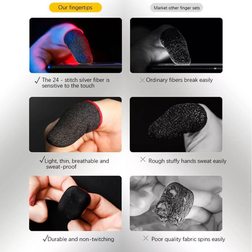 - Sản phẩm chủ yếu được sử dụng khi chơi game, độ nhạy cao, không in ấn vân tay lên màn hình khi đeo găng, hạn chế tối đa mồ hôi tiết ra, thấm hút siêu mạnh và khô ráo nhanh chóng, dễ dàng càng quét những tựa game cần phản xạ như PUBG, Liên Quân Mobile, Liên Minh Tốc Chiến, Mobile Legend hay những tựa game Moba khác