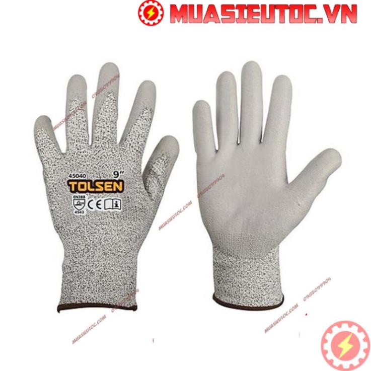 Bao tay vải chống cắt Tolsen được làm từ sợi HPPE liền mạch kết hợp PU tạo sự thoải mái và bảo vệ cắt tuyệt đối cho người dùng.