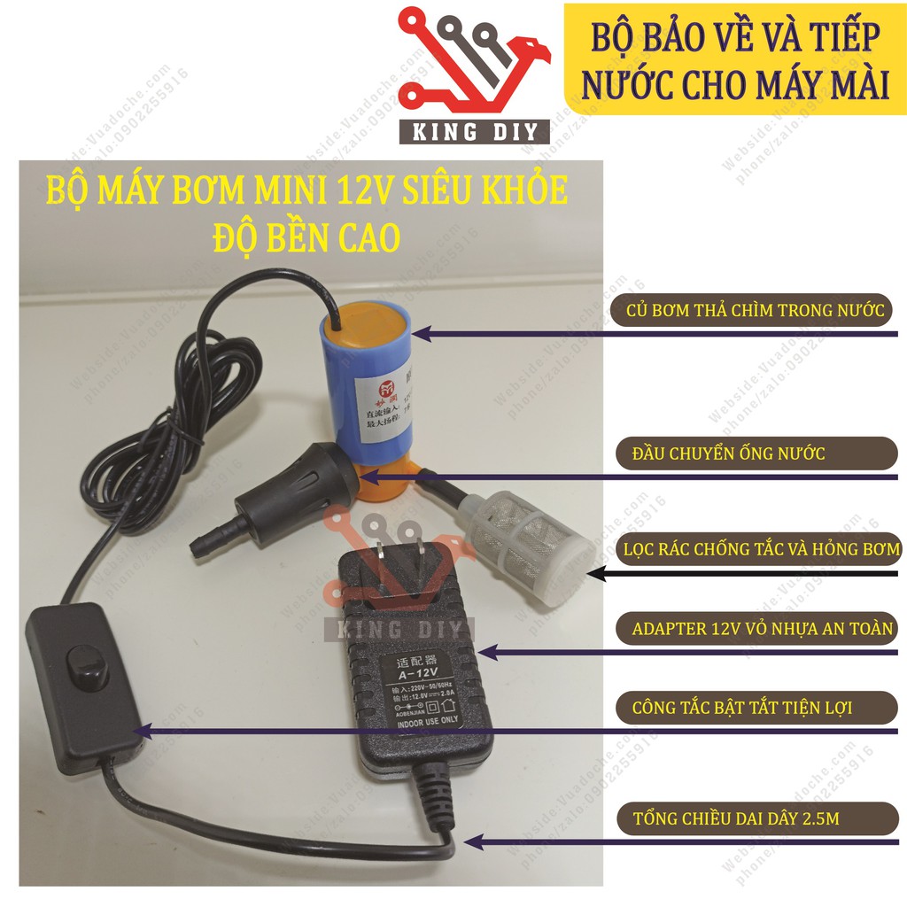 - Tiếp nước dễ dàng với máy bơm chìm mini 12V , dễ dàng làm mát đĩa mài, đĩa cắt và chống bụi tối đa