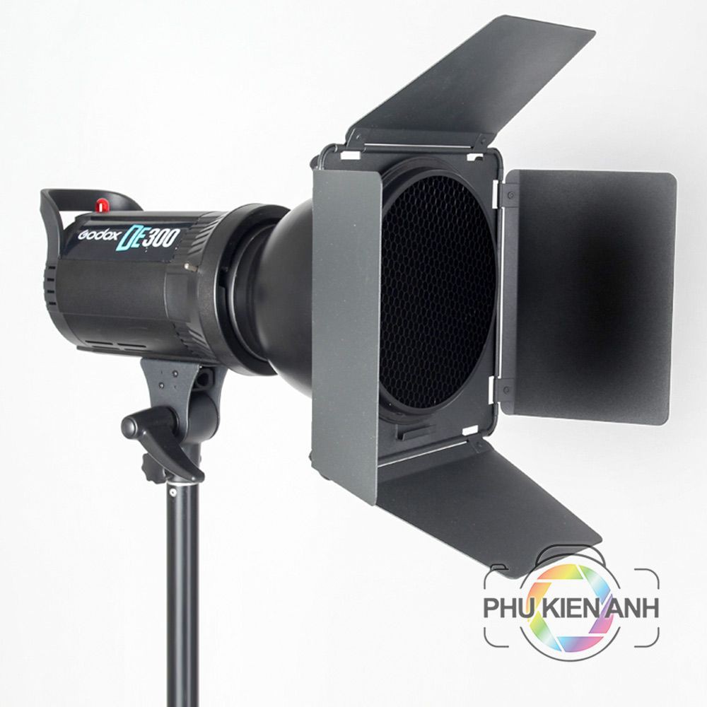 Barndoor 4 filter màu, lưới tổ ong, ngàm bowen. Dễ sử dụng và có lưới tổ ong kim loại giúp hướng ánh sáng tốt hơn, tập trung hơn.Sử dụng ngàm đèn studio Bowen phổ thông cho các đèn studio hiện nay.