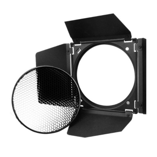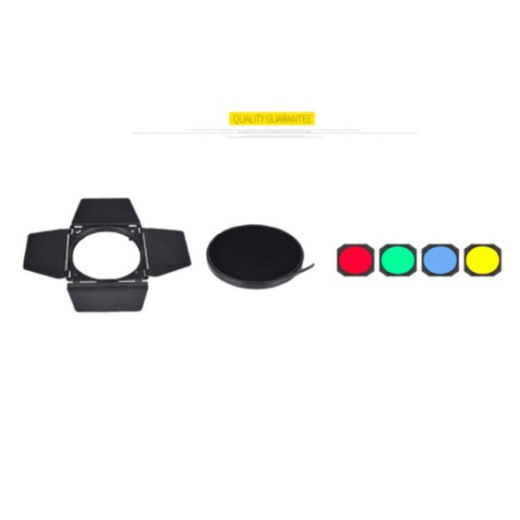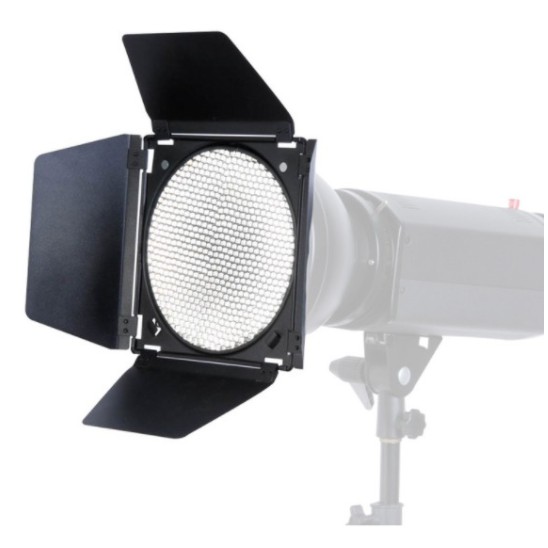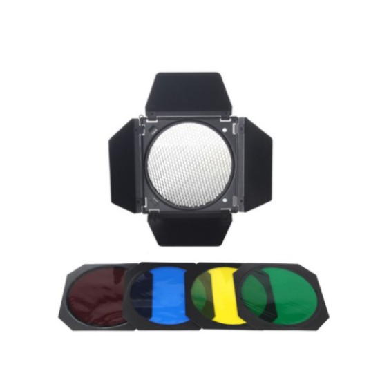 Barndoor 4 filter màu, lưới tổ ong, ngàm bowen. Dễ sử dụng và có lưới tổ ong kim loại giúp hướng ánh sáng tốt hơn, tập trung hơn.Sử dụng ngàm đèn studio Bowen phổ thông cho các đèn studio hiện nay.