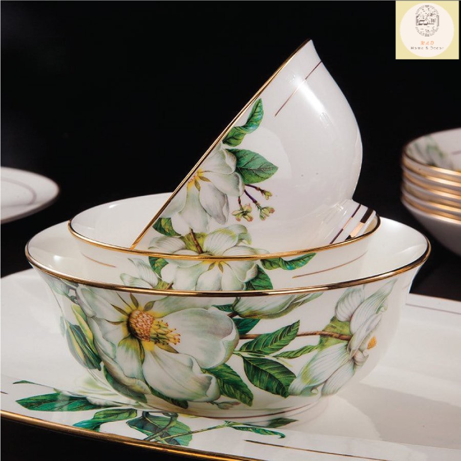 Nhà cửa & Đời sống > Bộ đồ bàn ăn > Tô || Bộ Bát 10 người, Bộ bát đĩa sứ xương viền vàng hoa mộc lan cao cấp 60 chi tiếtCòn hàng
