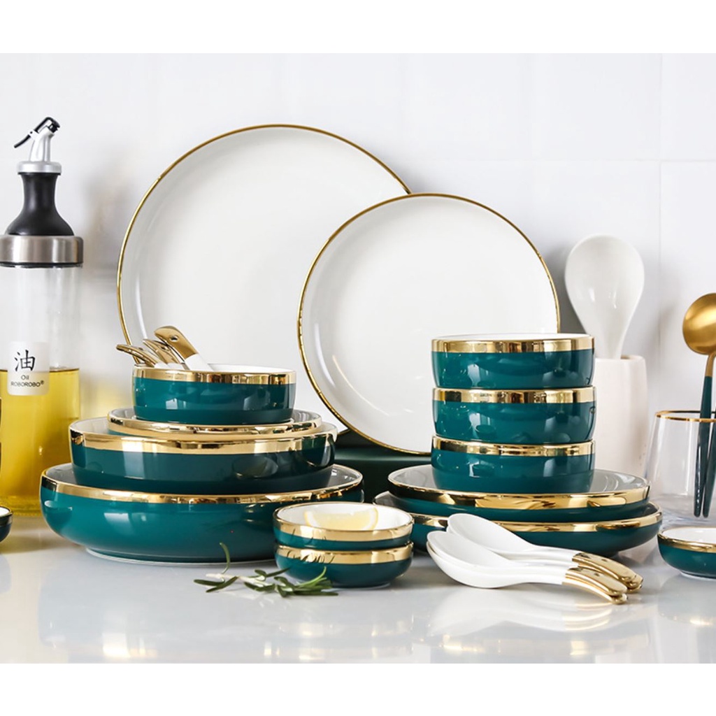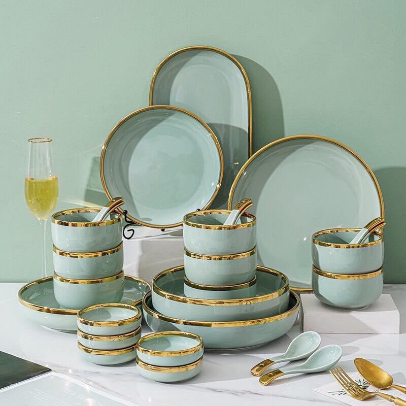 Nhà cửa & Đời sống > Bộ đồ bàn ăn > Dĩa || Bộ Bát 32 chi tiết cẩm thạch vân đã xanh viền vàng cao cấp kèm đũa INOX304 theo tông màu bát. chén đĩa 32 chi tiết.Còn hàng