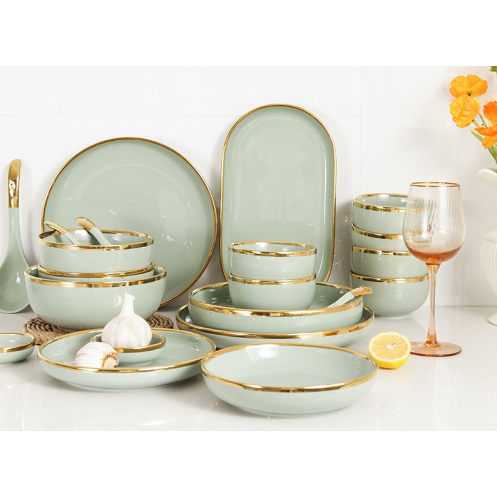 Bộ Bát 32 chi tiết cẩm thạch vân đã xanh viền vàng cao cấp kèm đũa INOX304 theo tông màu bát. chén đĩa 32 chi tiết.