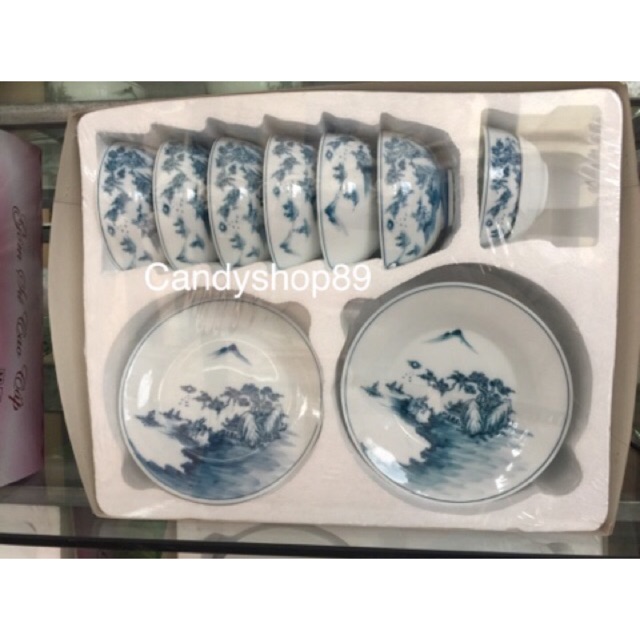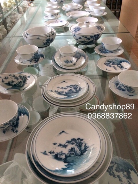 Bộ bát ăn Bát Tràng cảnh sơn thuỷ men xanh lamHàng chuẩn loại 1 chất men trắng hoa văn sắc nét