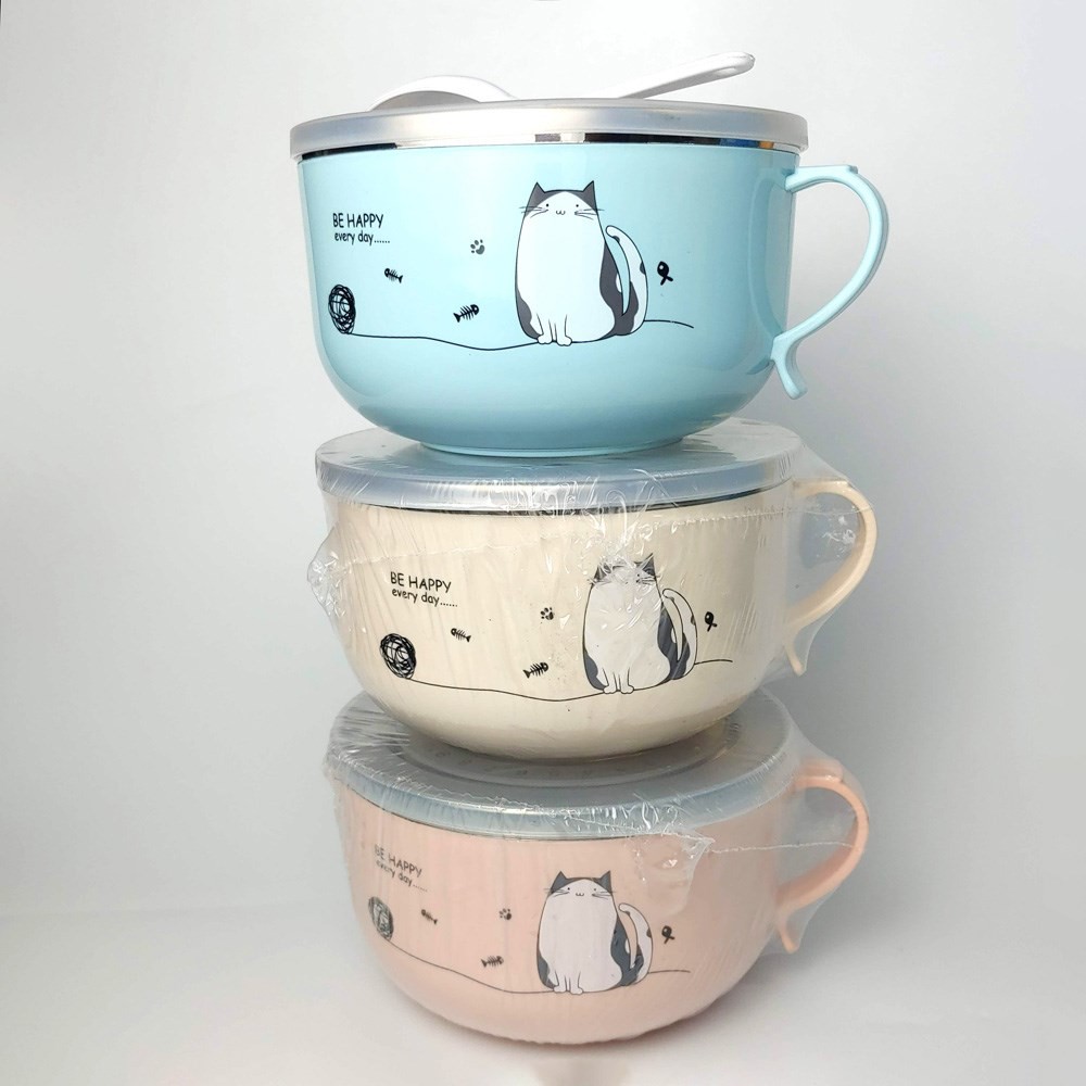 BÁT ĂN CHÁO MÌ PHỞ loại 2 lớp cách nhiệt - bát cháo kèm nắp và thìa nhựaBát size 14cm, bên ngoài bằng nhựa, bên trong bằng inox.