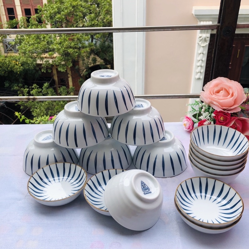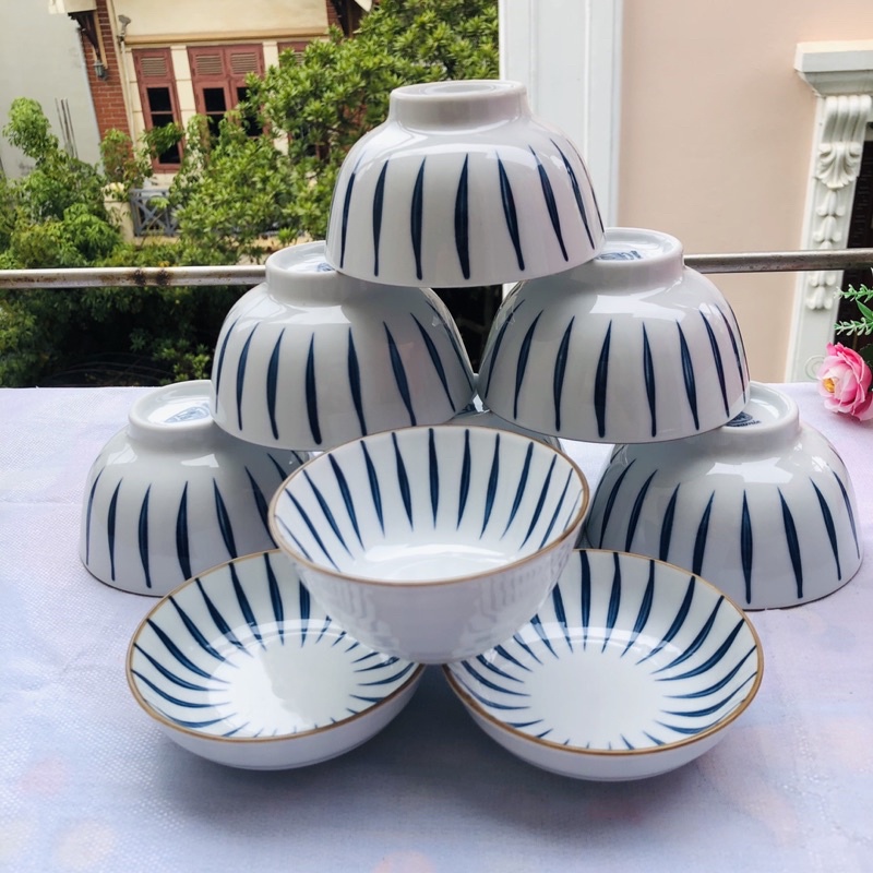 Nhà cửa & Đời sống > Bộ đồ bàn ăn > Tô || Bộ bát ăn cơm 10 bát gốm Bát Tràng,họa tiết kẻ trúc viền vàng,bát bằng sứ mâm cơm gia đìnhCòn hàng