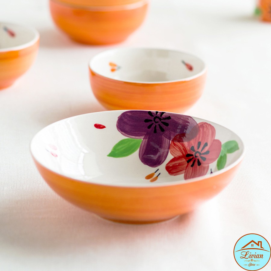 Bát ăn cơm � chén ăn cơm, bát gia vị bằng sứ có tay cầm họa tiết hoa lá cam nổi bật