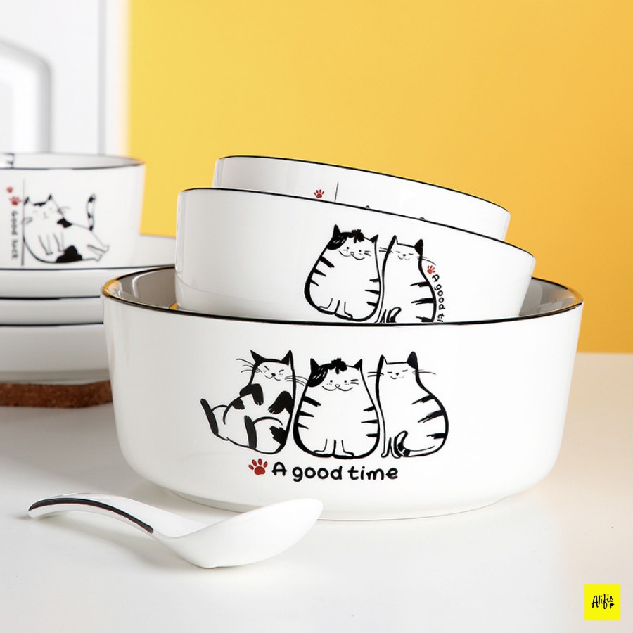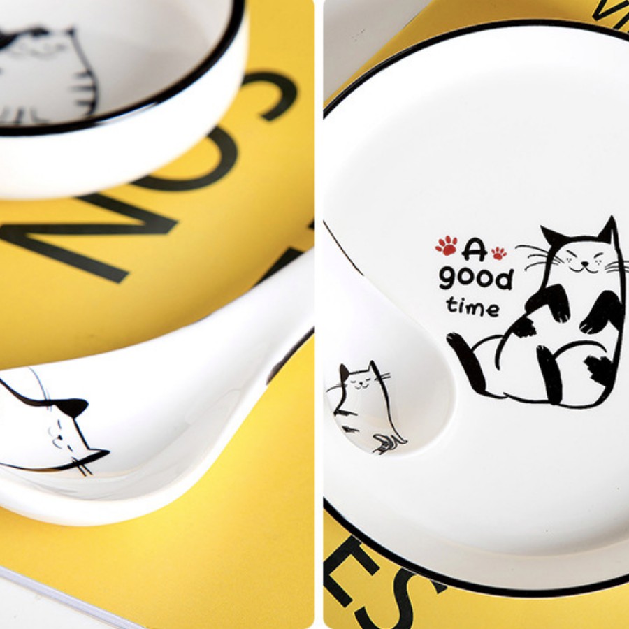 Nhà cửa & Đời sống > Bộ đồ bàn ăn > Dĩa || Bát ăn cơm, muỗng và đĩa gia vị họa tiết mèo đáng yêuCòn hàng