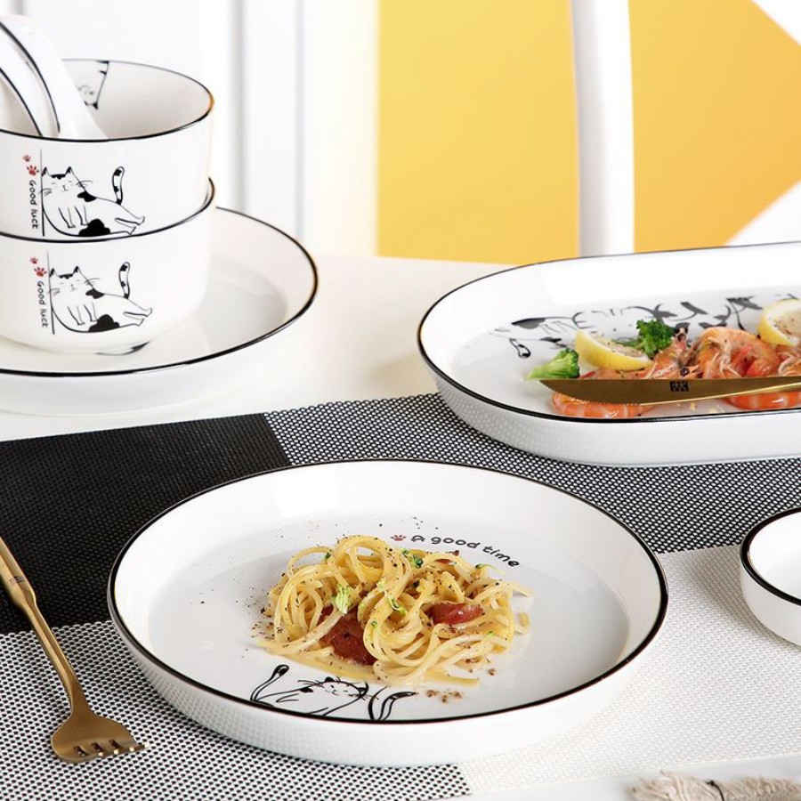 - Bát đĩa với họa tiết mèo đáng yêu kết hợp viền đen nổi bật.
