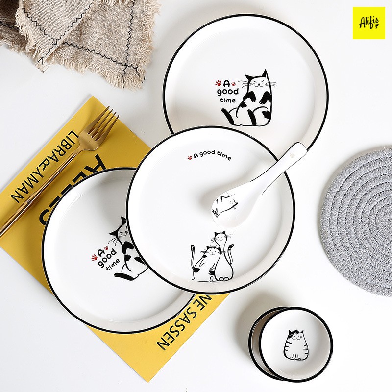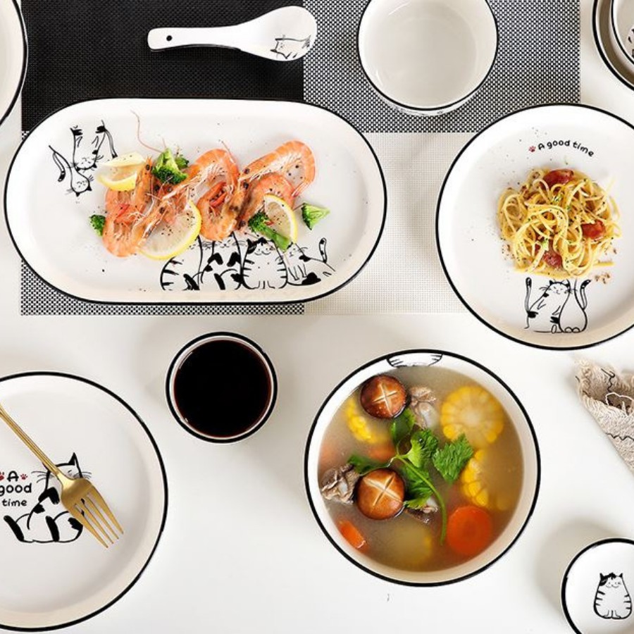 🌻 Bát đĩa có họa tiết: Mèo đáng yêu