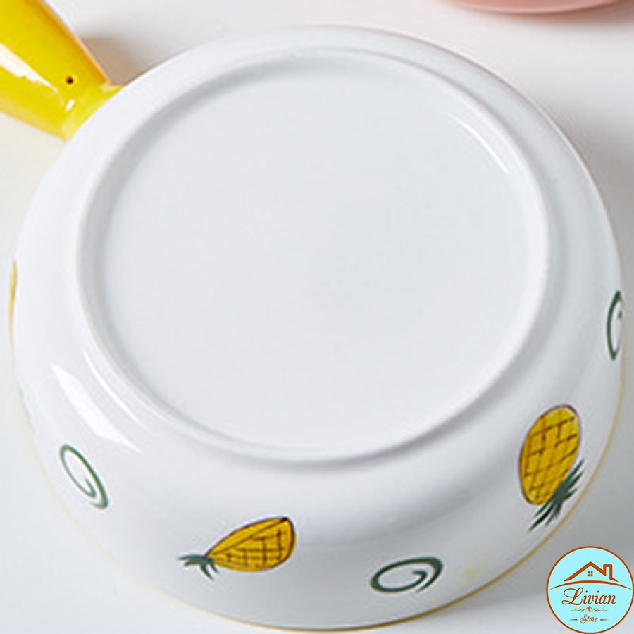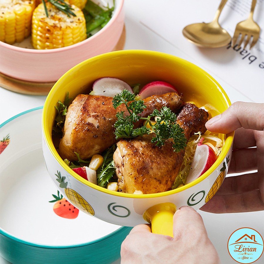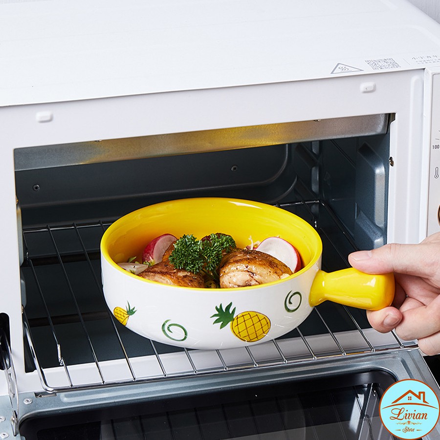 Bát ăn dặm, thố nướng tròn có tay cầm cao cấp 15.5cm họa tiết quả dứa, dâu tây