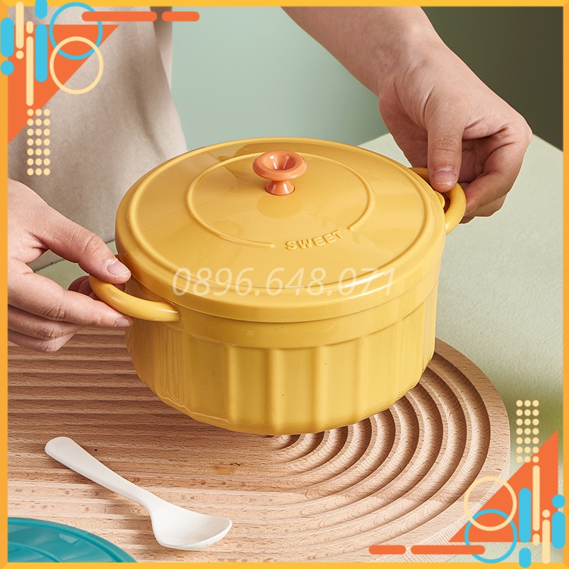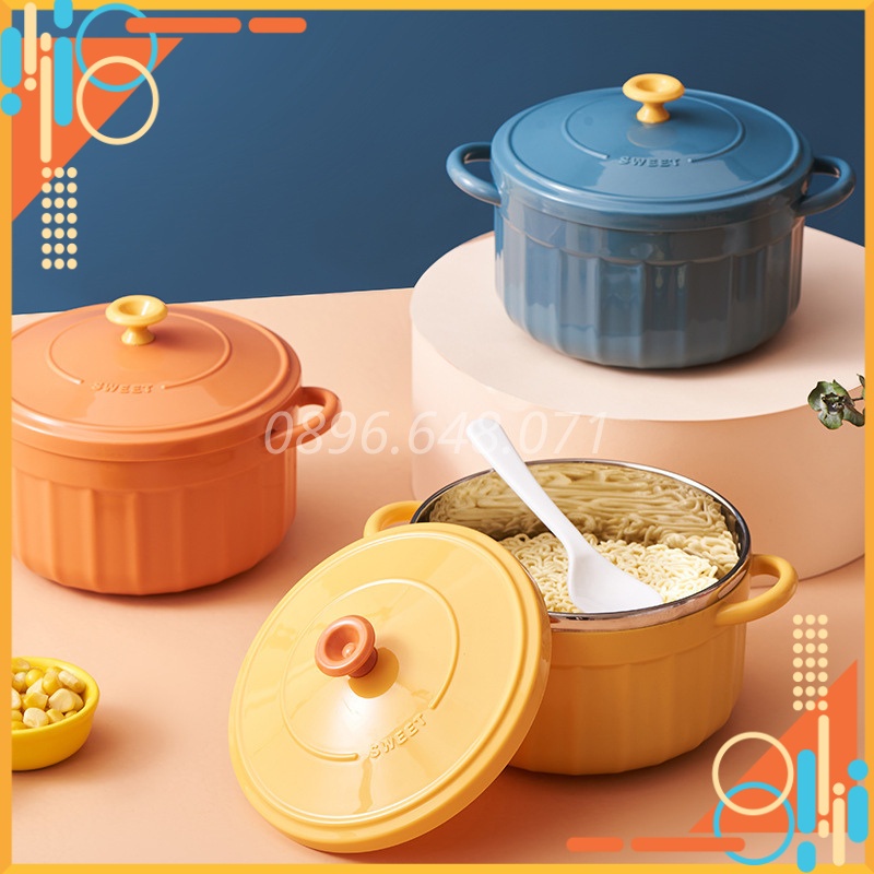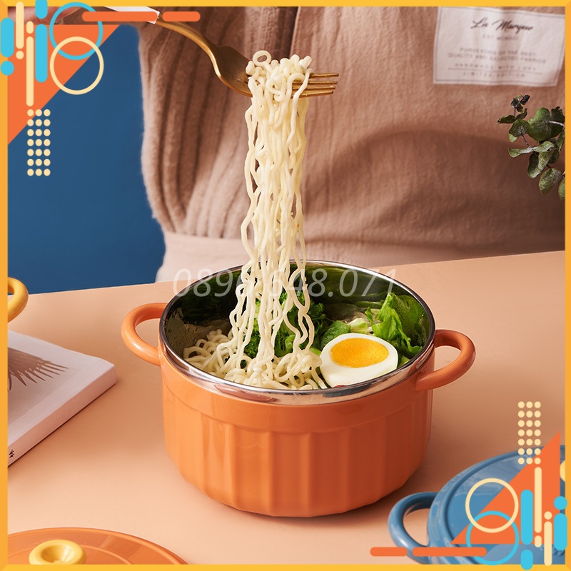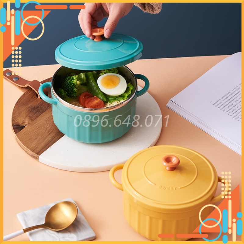 Bát Ăn Mì Có Nắp Cute Có Tay Cầm Inox Phong Cách Hàn Quốc Kèm Thìa, Bát Úp Mì Tôm Tiện Lợi Cực Xinh