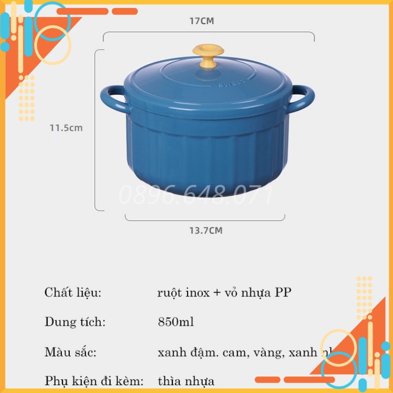 Bát Ăn Mì Có Nắp Cute Có Tay Cầm Inox Phong Cách Hàn Quốc Kèm Thìa, Bát Úp Mì Tôm Tiện Lợi Cực XinhBát ăn mì có nắp lõi trong làm bằng inox đảm bảo an toàn khi sử dụng vơí nước sôi 100 độ. Bát ăn mì có tay cầm giúp bạn cầm bát dễ dàng hơn bao giờ hết mà không lo bị bỏng. Vỏ ngoài bằng nhựa cách nhiệt giúp giảm khối lượng cốc cũng như màu sắc đẹp và bắt mắt hơn.