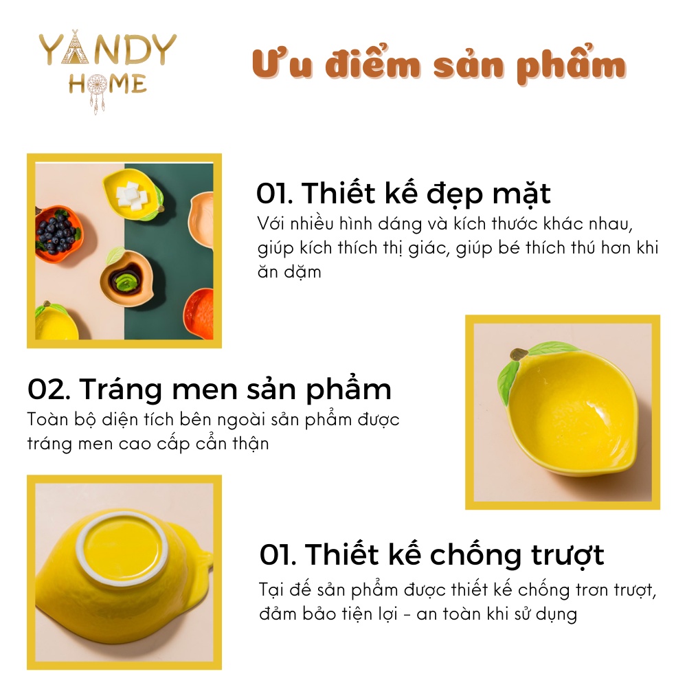 Giới thiệu Bát chén dĩa nước chấm gia vị YANDY HOME B01 ăn dặm cho bé bằng gốm sứ men đẹp bóng hình quả con vật nồi niêu