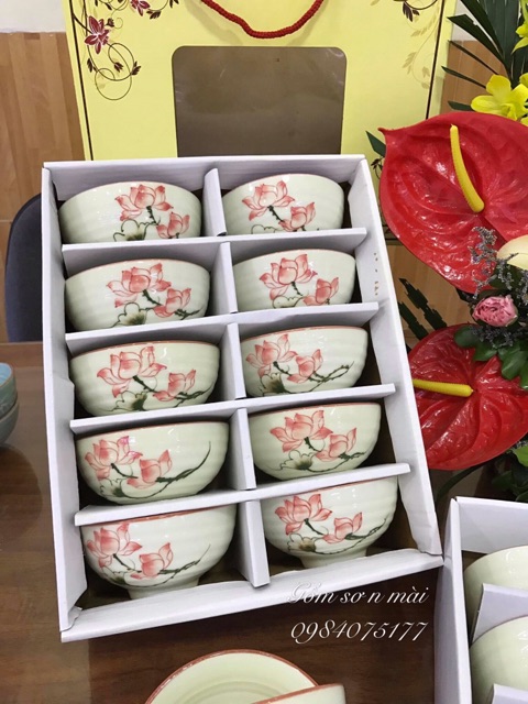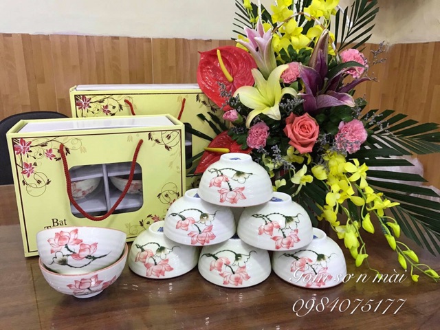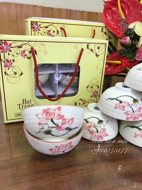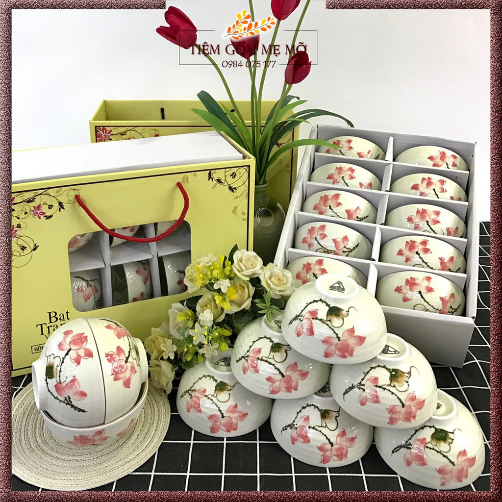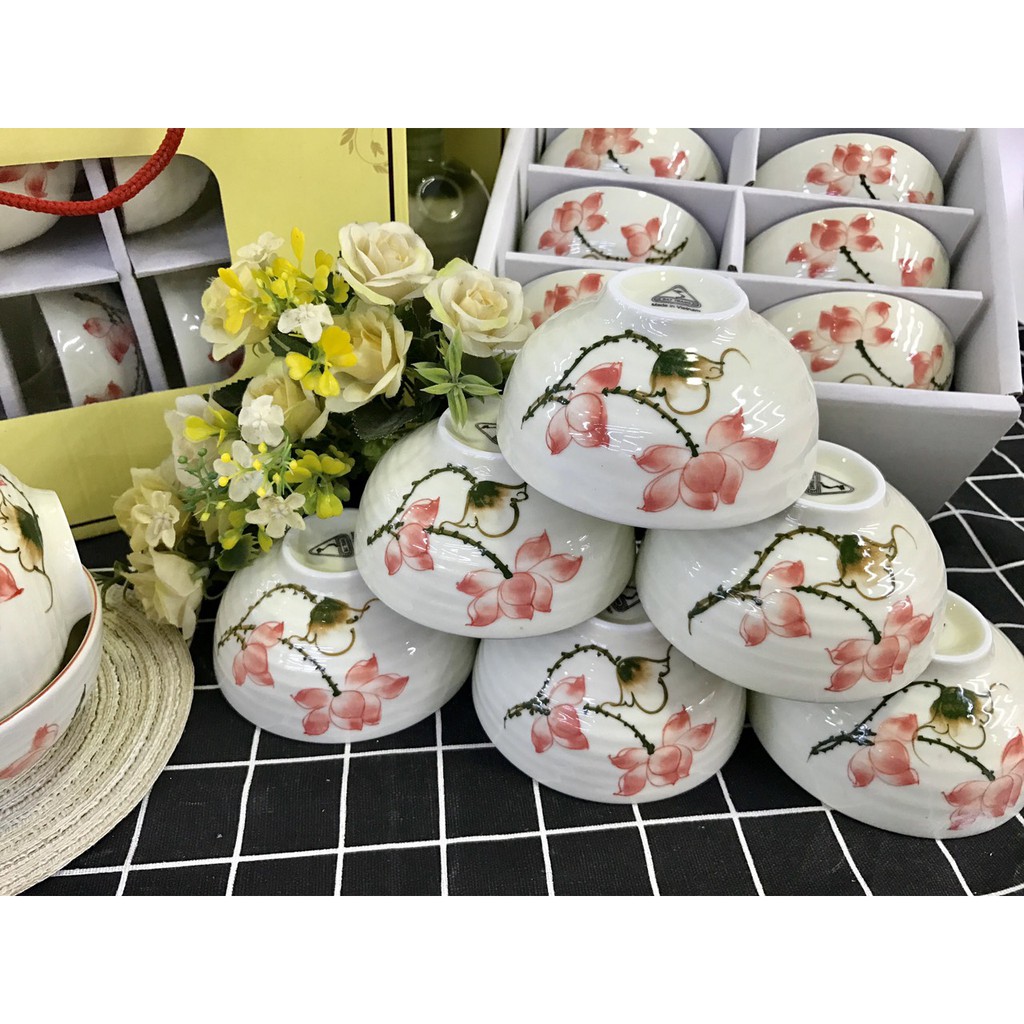 Giới thiệu Bộ bát cơm chén cơm men kem họa tiết sen hồng vẽ tay gốm sứ Bát Tràng