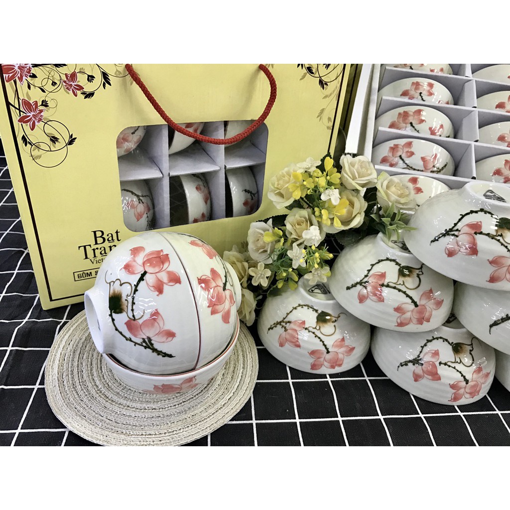 Nhà cửa & Đời sống > Bộ đồ bàn ăn > Tô || Bộ bát cơm chén cơm men kem họa tiết sen hồng vẽ tay gốm sứ Bát TràngCòn hàng