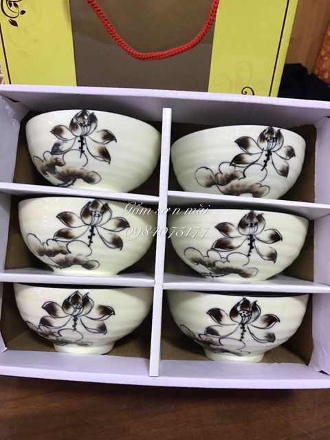 Giới thiệu Bộ bát cơm chén cơm men kem họa tiết sen đen vẽ tay gốm sứ Bát Tràng