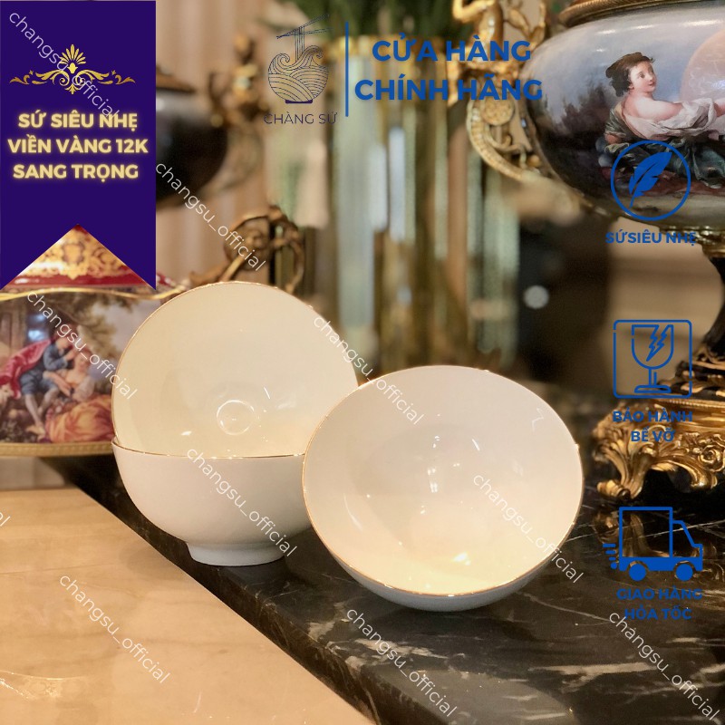 Bộ bát cơm viền vàng 12k sứ siêu nhẹ sang trọng - Set 6 và 10 chén bát cao cấp sứ xương siêu nhẹ Minh Châu