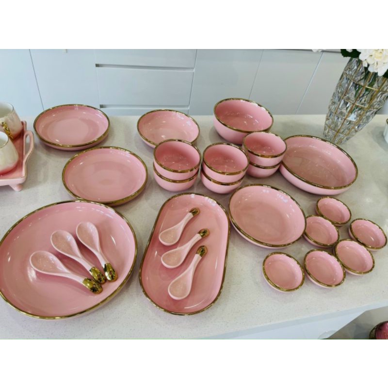 Bộ bát đĩa 26 món cao cấp - Chén bát sứ màu hồng cao cấp viền vàng