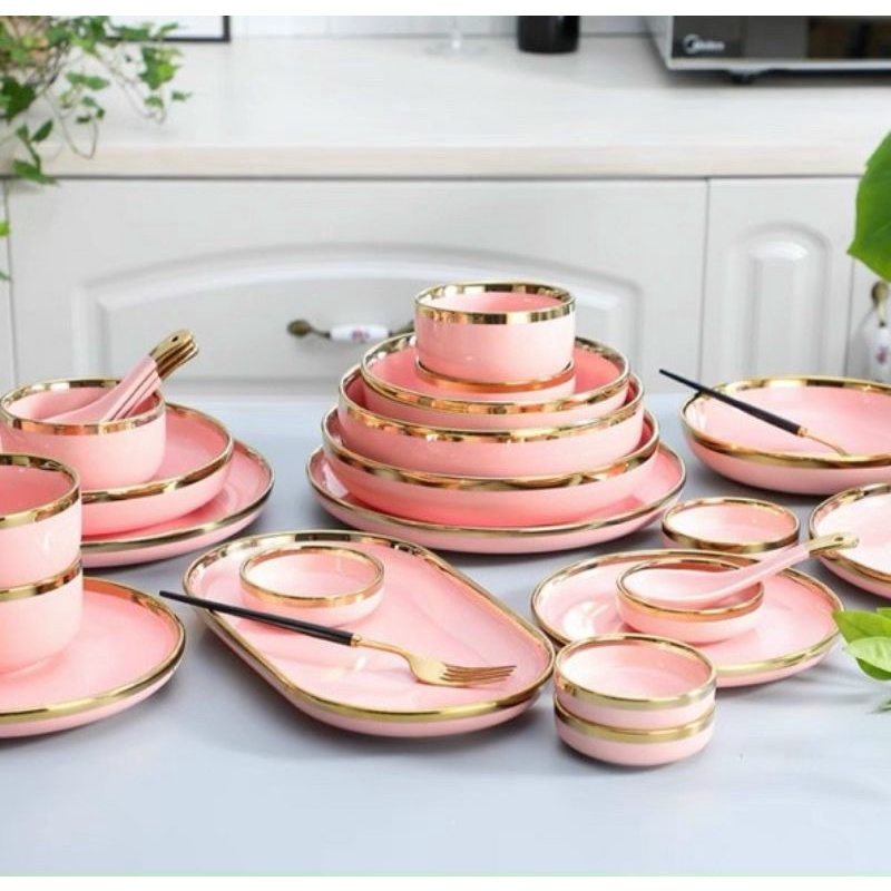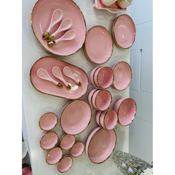 Nhà cửa & Đời sống > Bộ đồ bàn ăn > Tô || Bộ bát đĩa 26 món cao cấp - Chén bát sứ màu hồng cao cấp viền vàngCòn hàng