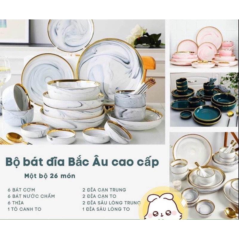 Bộ bát đĩa 26 món vân hồng viền mạ vàng phong cách Bắc Âu