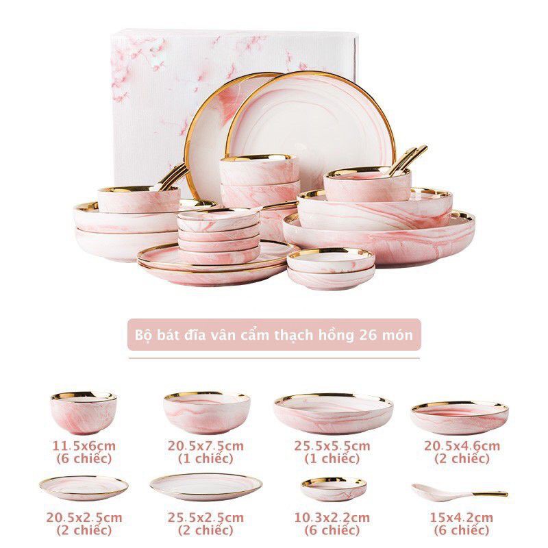 Bộ bát đĩa 26 món vân cẩm thạch hồng viền mạ vàng sang trọng- Sản phẩm được làm từ chất liệu gốm sứ cao cấp, bền đẹp, được tráng men sáng bóng, hoạ tiết vân hồng đẹp mắt. Chất liệu không chứa chì, kim loại nặng, không độc hại, tuyệt đối an toàn cho sức khoẻ người sử dụng