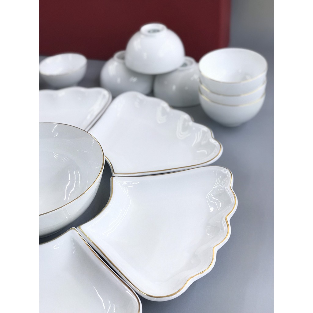 Bộ Bát Đĩa 6 Cánh Hoa Mặt Trời Trắng Chỉ Vàng Kim - Bát Đĩa Gia Tiên Gốm Sứ Bát Tràng
