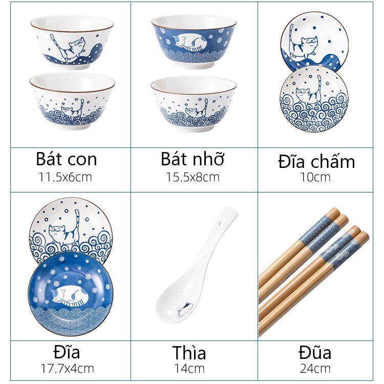 Bộ bát đĩa 6 món hình mèo phong cách Nhật Bản, quà tặng độc thân, set bát đĩa 1 người