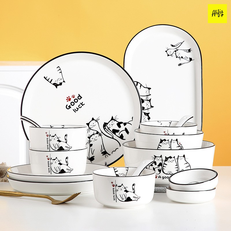 - Bát đĩa với họa tiết mèo đáng yêu kết hợp viền đen nổi bật.