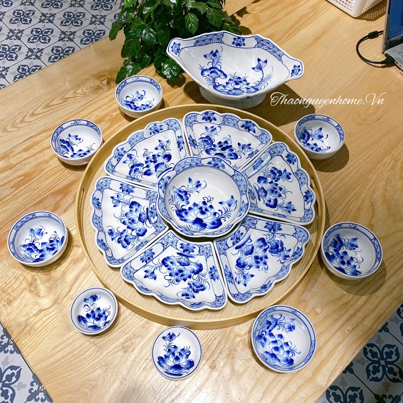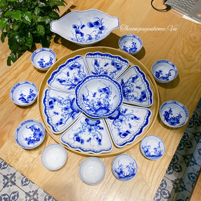 Bộ bát đĩa Bát Tràng xịn sứ lam vẽ tay cao cấp