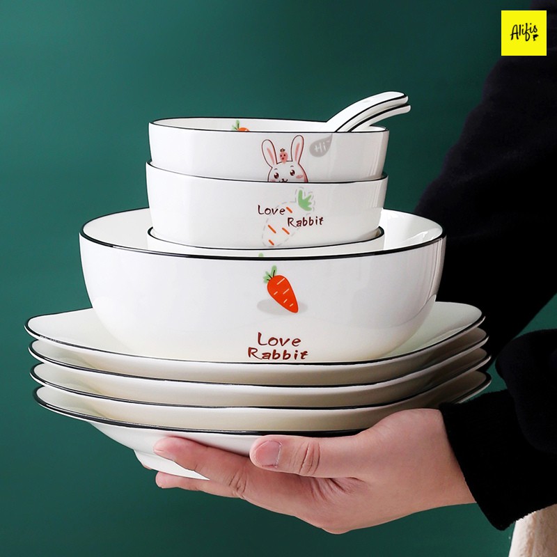 - Bộ bát đĩa họa tiết Love Rabbit được làm từ chất liệu gốm sứ cao cấp, bền, sáng, đẹp màu men sáng bóng, không chì, không độc hại