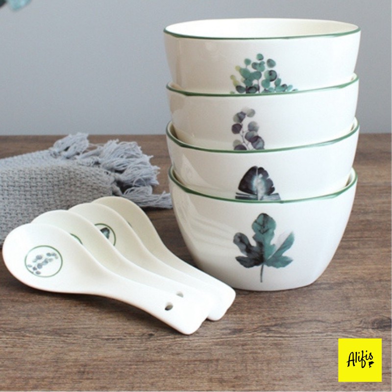 + Bộ bát được thiết kế sang trọng kết hợp họa tiết cây lá nhiệt đới siêu yêu ạ.