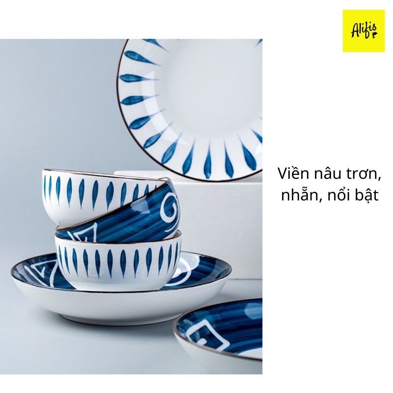 Bộ bát phong cách Nhật viền nâu - 35 món - mix 2 họa tiết - kèm hộp quà tặng-B3.365