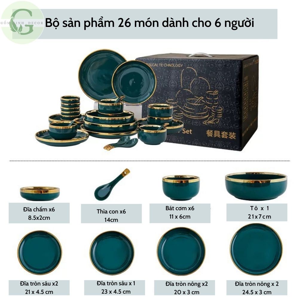 - Sản phẩm: Bộ bát đĩa cao cấp,chén dĩa sứ 26 món viền vàng cho 6 người gồm: