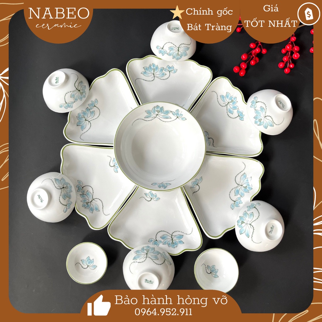 Bộ Bát Đĩa Cúng Gia Tiên Hoa Sen Xanh, Bộ Mặt Trời Thắp Hương Đường Kính 45cm 15 Chi Tiết - Gốm Sứ Bát TràngSize M: đường kính 45cm