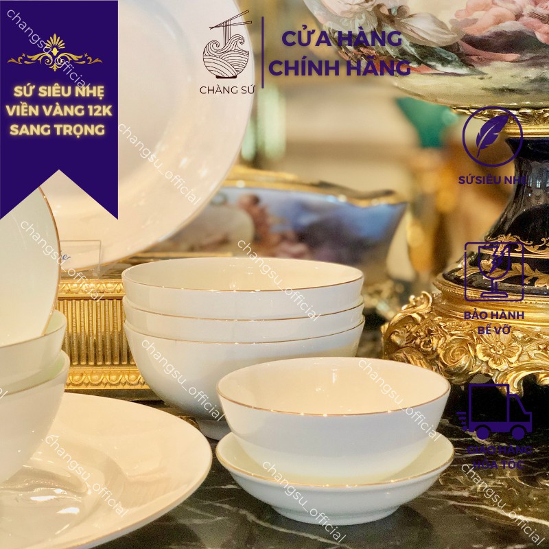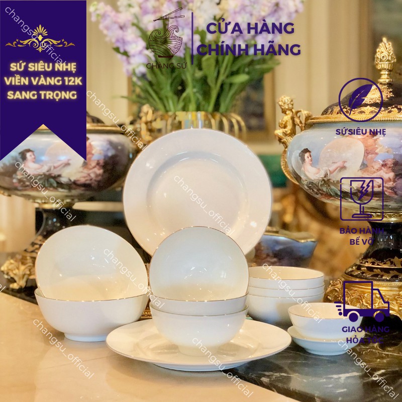 Bộ bát đĩa đẹp 12 món sứ xương viền vàng sang trọng - Sứ xương siêu nhẹ Minh Châu