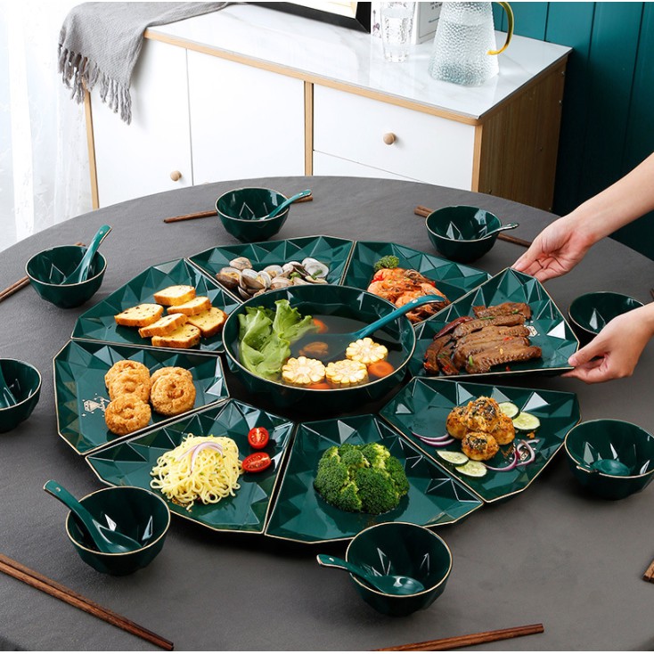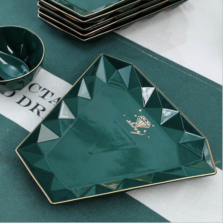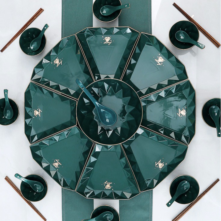 Nhà cửa & Đời sống > Bộ đồ bàn ăn > Dĩa || Bộ bát đĩa diamond 8 ☘𝘾𝘼𝙊 𝘾𝘼̂́𝙋☘ Bộ bát đĩa sứ kim cương 34 món xanh cổ vịt phong cách Bắc ÂuCòn hàng