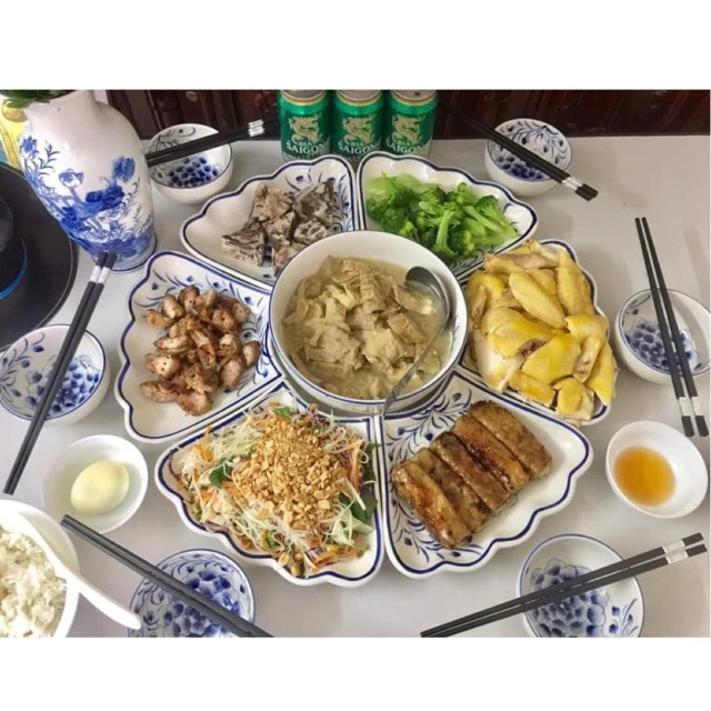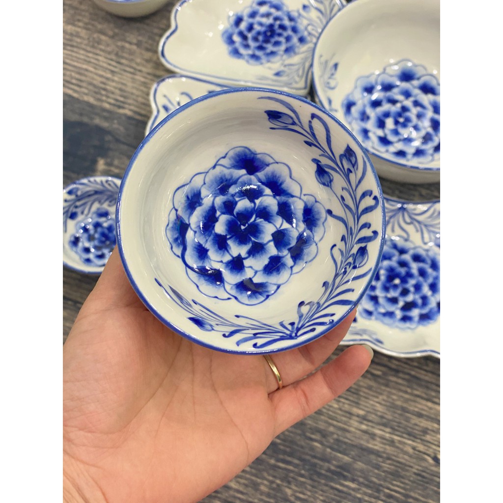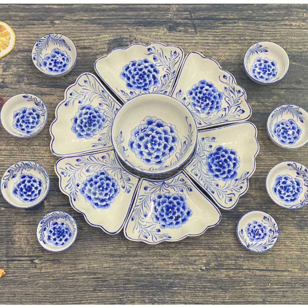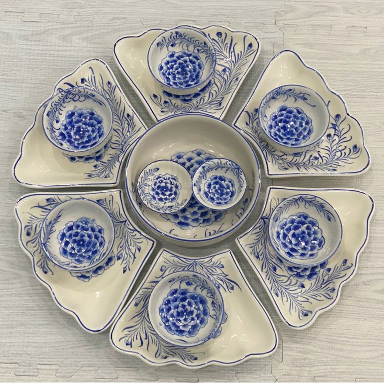 - Bộ đầy đủ: 1 tô lớn + 6 đĩa cánh hoa + 6 chén ăn cơm + 1 chén mắm + 1 chén muối
