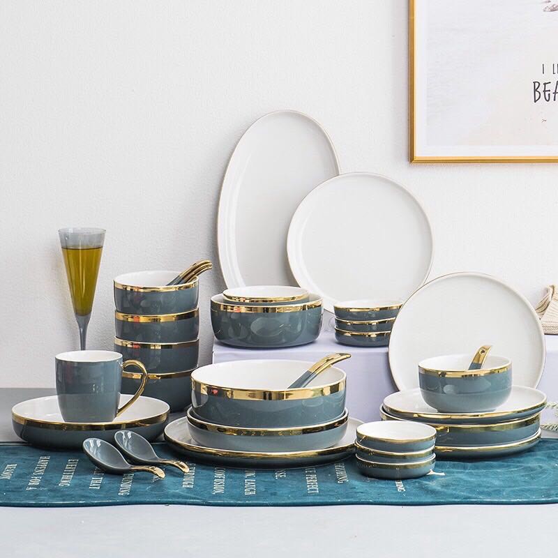 Bộ Bát đĩa gốm sứ (32 MÓN ) vân đá Xanh viền vàng tinh tế cao cấp, sang trọng.