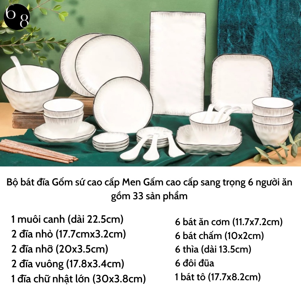 Bát Đĩa Gốm Sứ Cao Cấp Bộ Đồ Ăn Màu Trắng Men Gấm Phong Cách Châu Âu 33 Món 6 Người Ăn