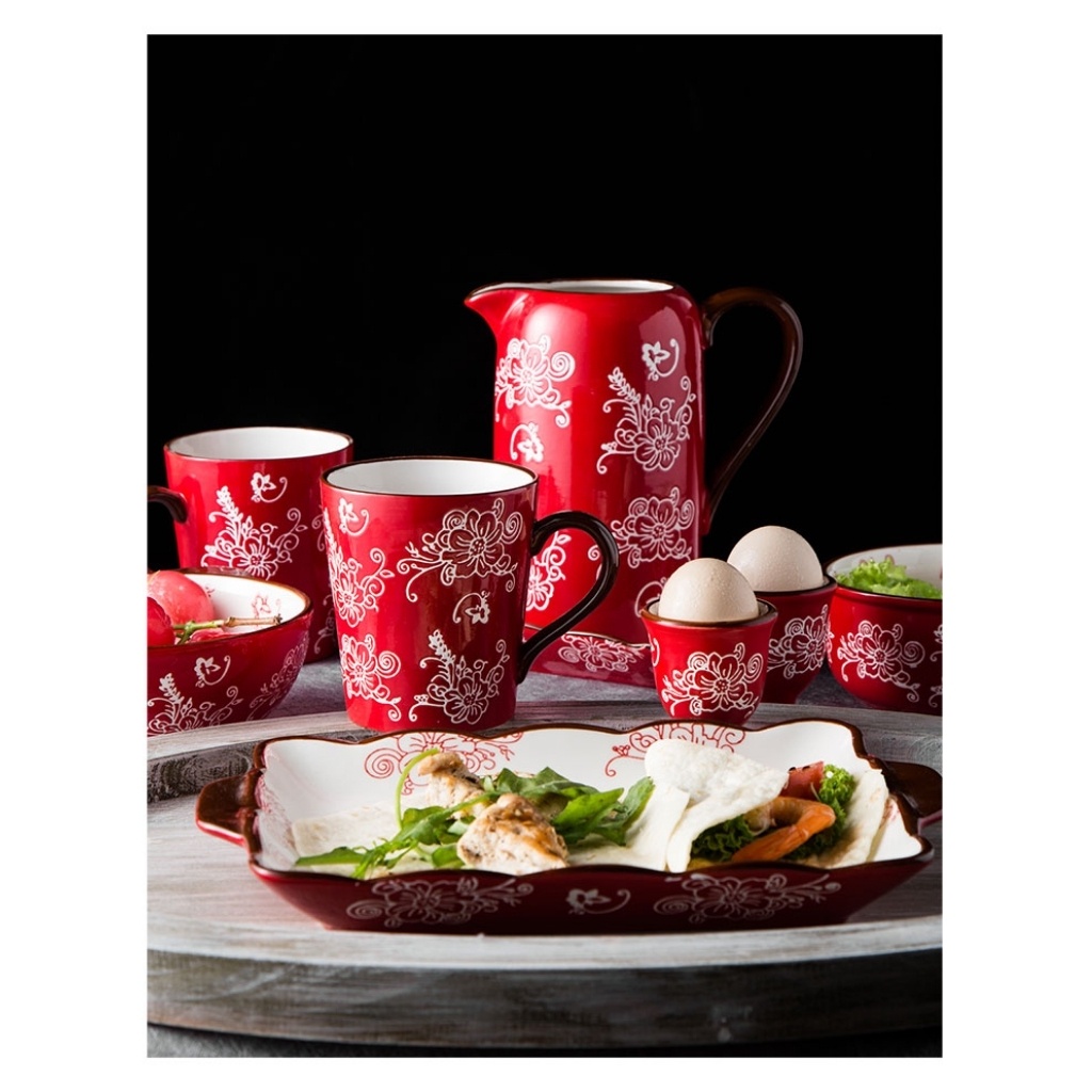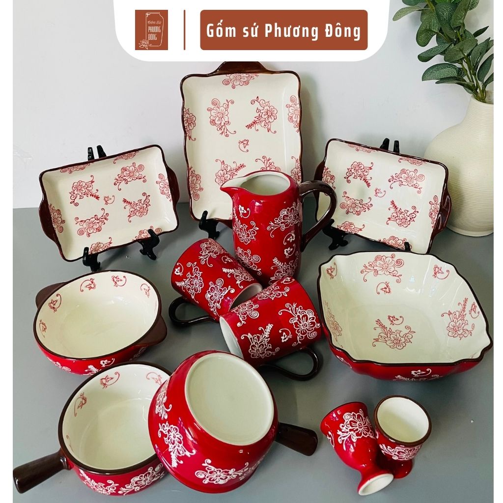 Bộ bát đĩa gốm sứ cao cấp màu đỏ sang trọng, hoạ tiết hoa vẽ tay thủ công phong cách Nhật Bản - Hàn Quốc