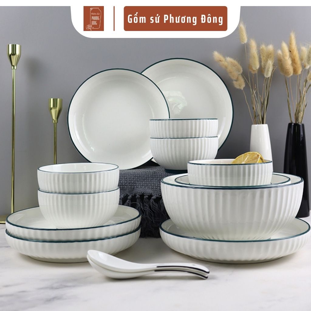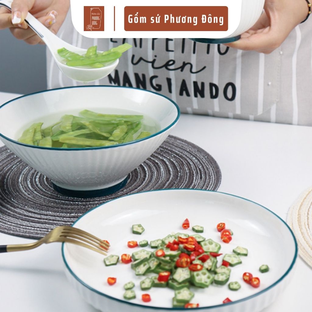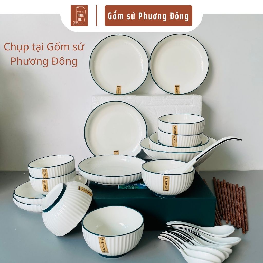 Nhà cửa & Đời sống > Bộ đồ bàn ăn > Tô || Bộ bát đĩa gốm sứ Phương Đông trắng viền xanh sang trọng, chén dĩa decor trang nhã, tặng kèm bộ đũa gỗCòn hàng