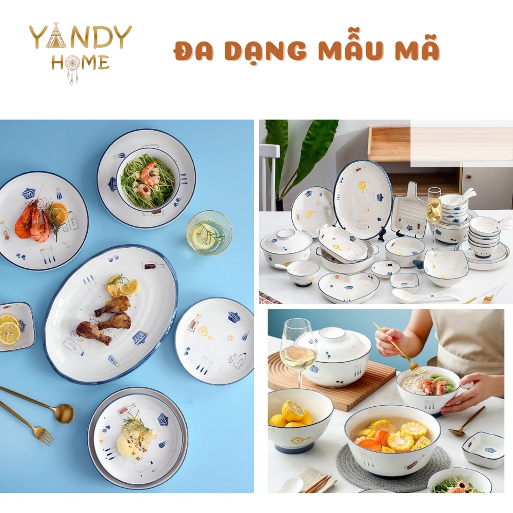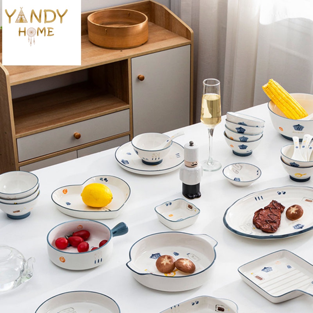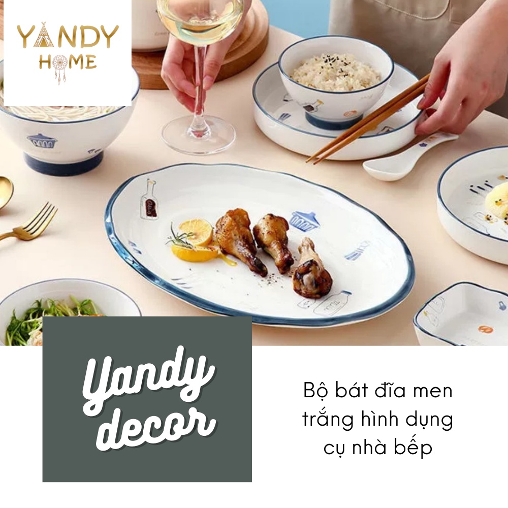 Bát đĩa gốm sứ YANDY HOME BB13 màu trắng họa tiết dụng cụ bếp men bóng đẹp dễ thương 15 chi tiết