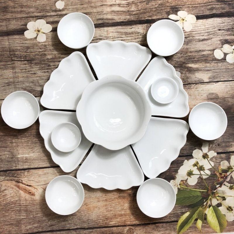 Bộ 7 món + 6 bát ăn cơm + 1 bát mắm + 1 đĩa gia vị.