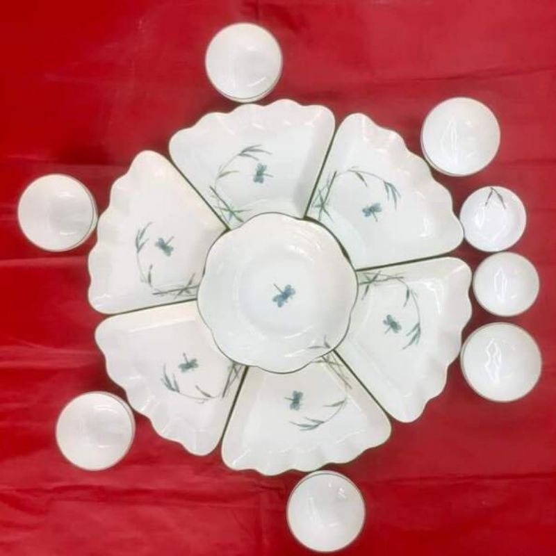 Bộ bát đĩa Hoa mặt trời vẽ cảnh Trúc chuồn - Hàng sứ bát tràng gồm 2 size là 45cm và 55cm.1 bộ gồm 7 chi tiết và 15 chi tiết.