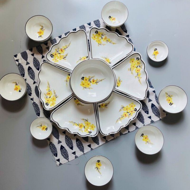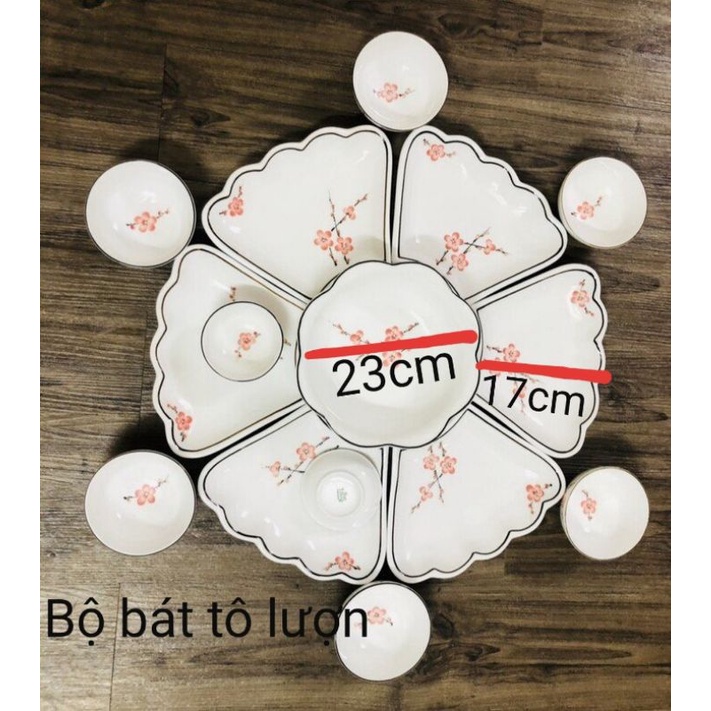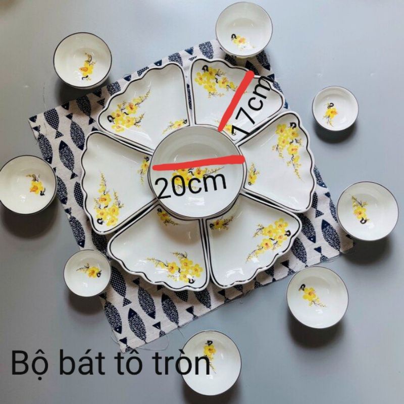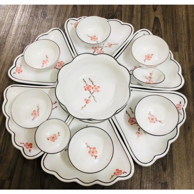 Bộ bát đĩa hoa mặt trời vẽ mai vàng,hoa đào hồng,đường kính 55cm.Hàng sứ Bát Tràng.Bộ gồm 7 món và 15 món,bát tô lượn và bát tô tròn.
